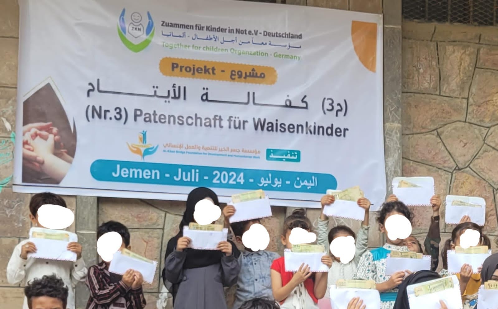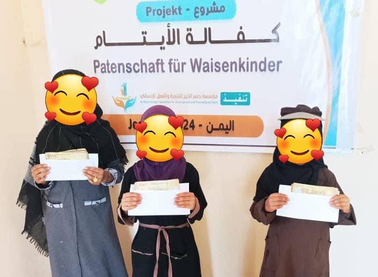 مؤسسة جسر الخير للتنمية والعمل الإنساني مستمرة فى كفالة العديد من الأيتام فى الجمهورية اليمنية لهذا العام 2025. المشروع بتمويل من مؤسسة معا من أجل الأطفال فى ألمانيا.